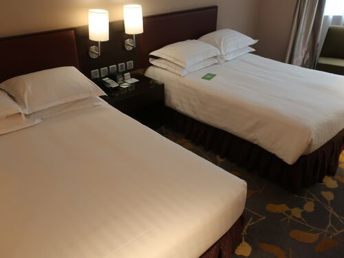 「デラックスツイン」 マカオにあるホリデイインマカオに宿泊しました。 建物低層部はコロニアル的な重厚感のある構えで客室フロアは近代的な高層ビルとなっていますが、建物が密集した地域ですので眺望はそれほど望めないだろうと予想がつきます。 ウエルカ…