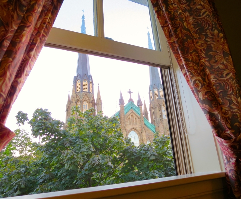 窓の外にはセント・ダンスタンズ・バシリカ大聖堂がそびえています。