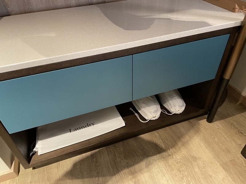 棚の下には使い捨てスリッパとランドリーバッグ。