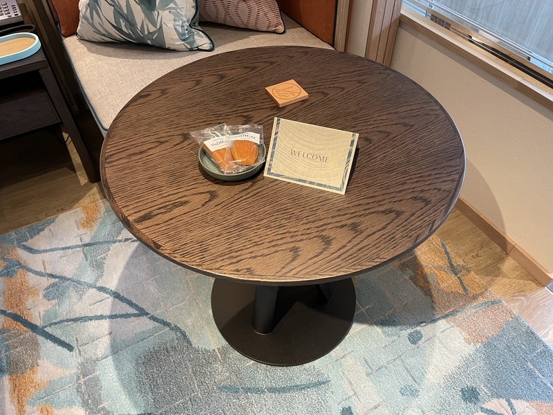 「インディゴ箱根」にあったような、パソコン作業のしやすいデザインでもなく、ただの丸テーブルです。