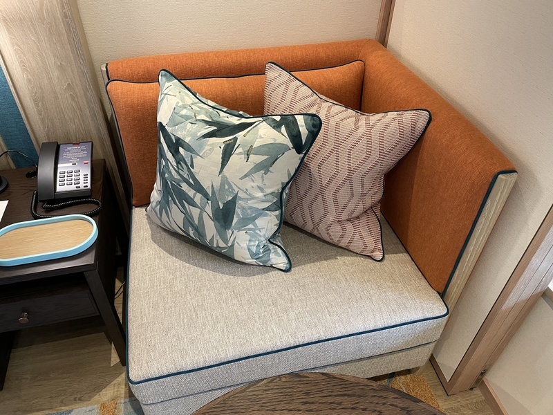 このソファに座ることで親密さを増したいという狙いがある2人連れには適しているサイズかもしれませんが、そういう関係ではない場合、どちらか一方が座っていれば、もうひとりはベッドに腰掛けるしかありませんでした。