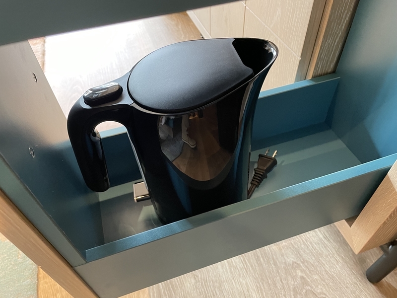 電気ポットは引き出しの中にあります。