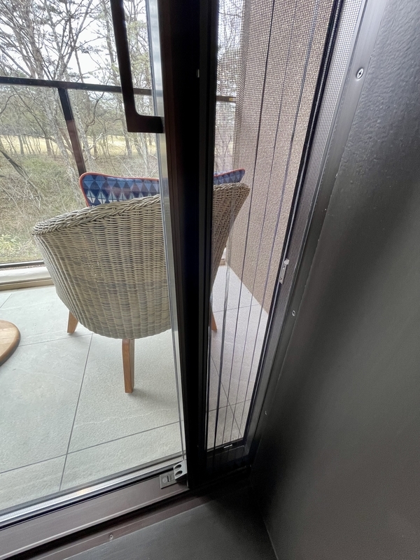 客室との仕切りには、折りたたみ式の網戸があって、引き戸とはマグネットでつながっています。